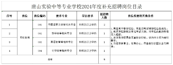 唐山实验中等专业学校2024年度补充招聘5人公告