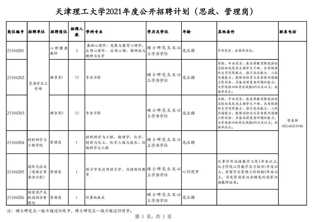 公开招聘方案于2021年4月8日在天津市教育委员会网站(http://jy.tj.gov.cn)和天津理工大学党委教师工作部(人事处)门户网站(http://rsc.tjut.edu.cn/)公开招聘专栏发布。具体招聘岗位见《天津理工大学2021年度公开招聘计划(思政、管理岗位)》(附件1)。