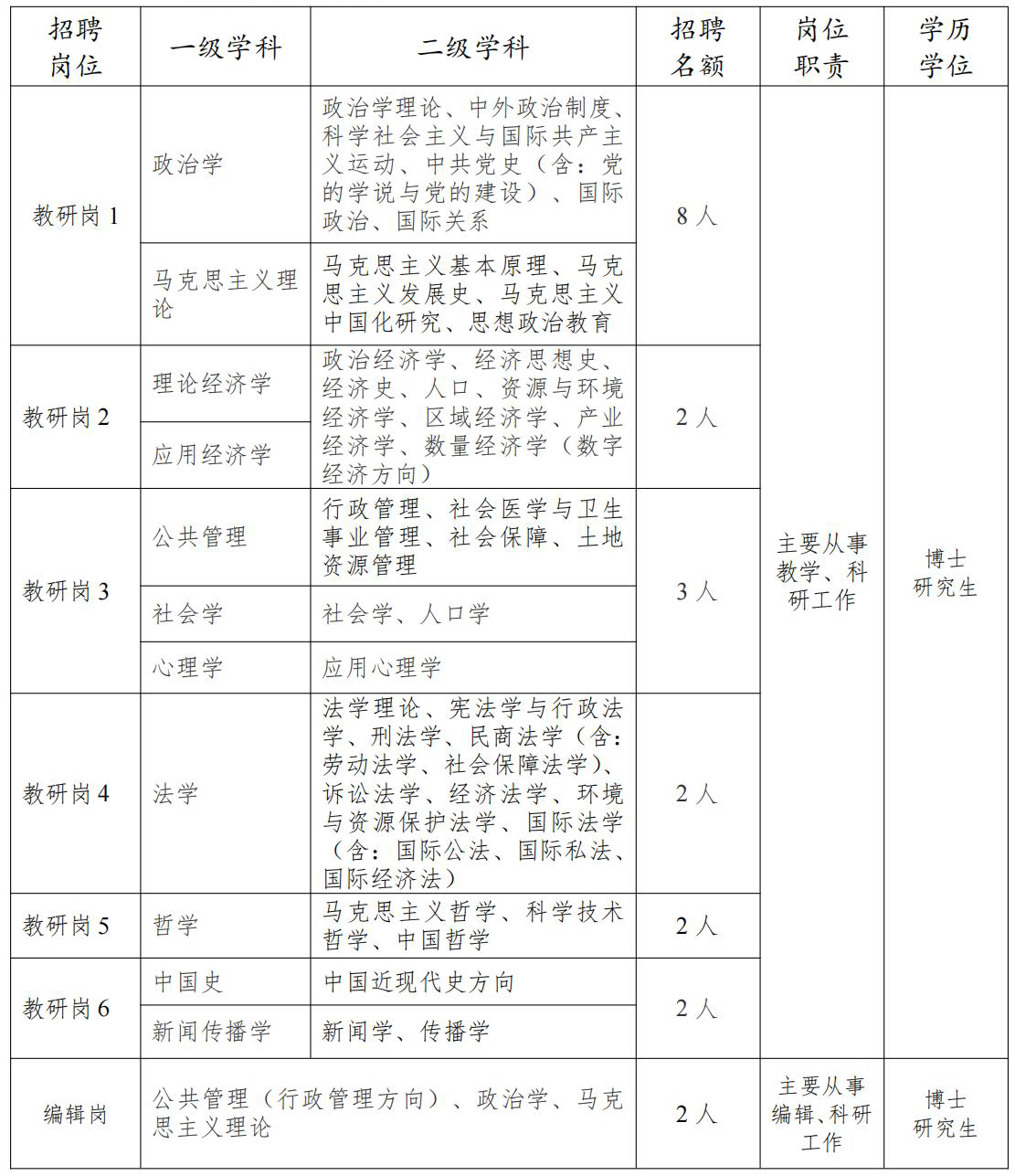 为进一步加强校(院、室)人才队伍建设,根据教学科研和学科建设需要,按照《天津市事业单位公开招聘人员实施办法(试行)》(津人社局发〔2011〕10号)、《市委组织部市人力社保局关于进一步完善事业单位公开招聘工作的通知》(津人社局发〔2017〕37号)和《市委组织部市人力社保局关于进一步做好事业单位公开招聘高校毕业生等有关工作的通知》(津人社办发〔2020〕100号),2022年,中共天津市委党校(天津行政学院、中共天津市委党史研究室)拟面向全国公开招聘21名博士研究生人员,现公告如下: