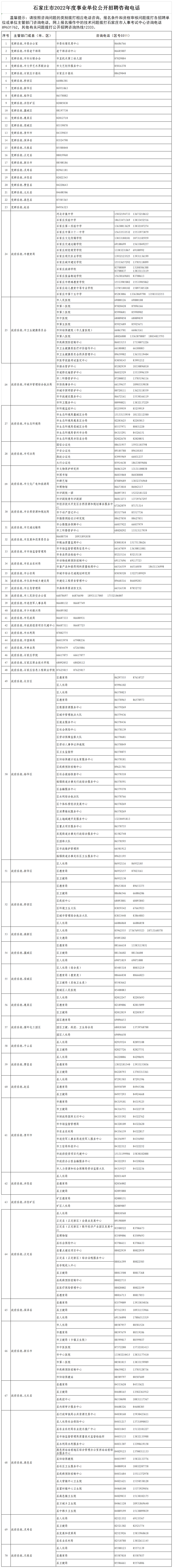 计划招聘事业单位工作人员6573名,各招聘单位的招聘岗位、招聘数量、资格条件等内容详见《石家庄市2022年度事业单位公开招聘岗位信息表》(附件1),咨询电话详见《石家庄市2022年度事业单位公开招聘咨询电话表》(附件2)。