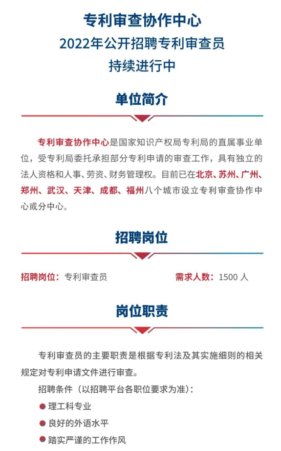 专利审查协作中心2022年公开招聘专利审查员