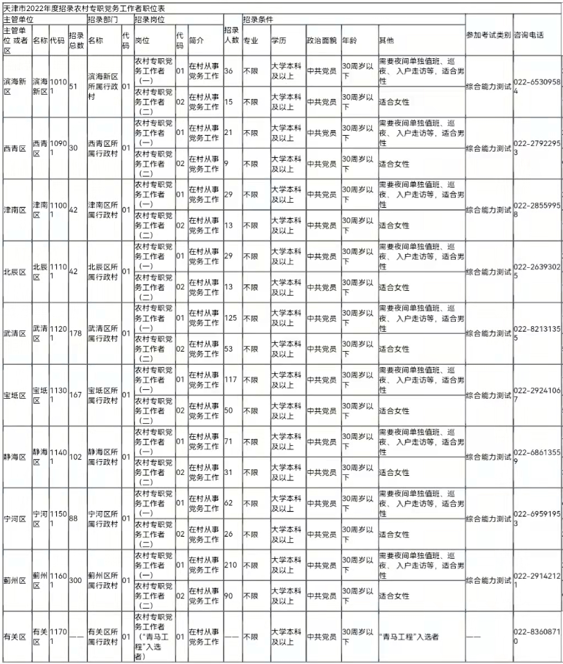 为深入实施乡村振兴战略,培养高素质干部队伍,促进农村基层组织建设,根据《天津市农村专职党务工作者管理办法(试行)》(津党厅〔2018〕60号)等有关规定,2022年,天津市计划面向全国招录1000名农村专职党务工作者。其中,滨海新区51名、西青区30名、津南区42名、北辰区42名、武清区178名、宝坻区167名、静海区102名、宁河区88名、蓟州区300名,统筹安排到所辖行政村工作。现就组织招录有关事项公告如下: