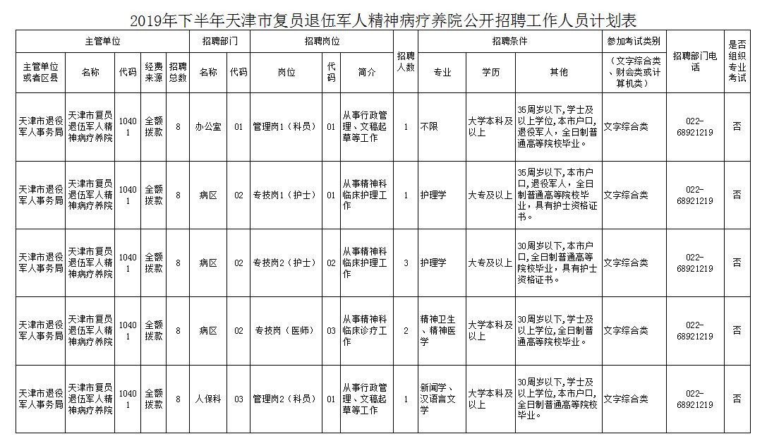 2019年下半年天津市复员退伍军人精神病疗养院公开招聘工作人员公告