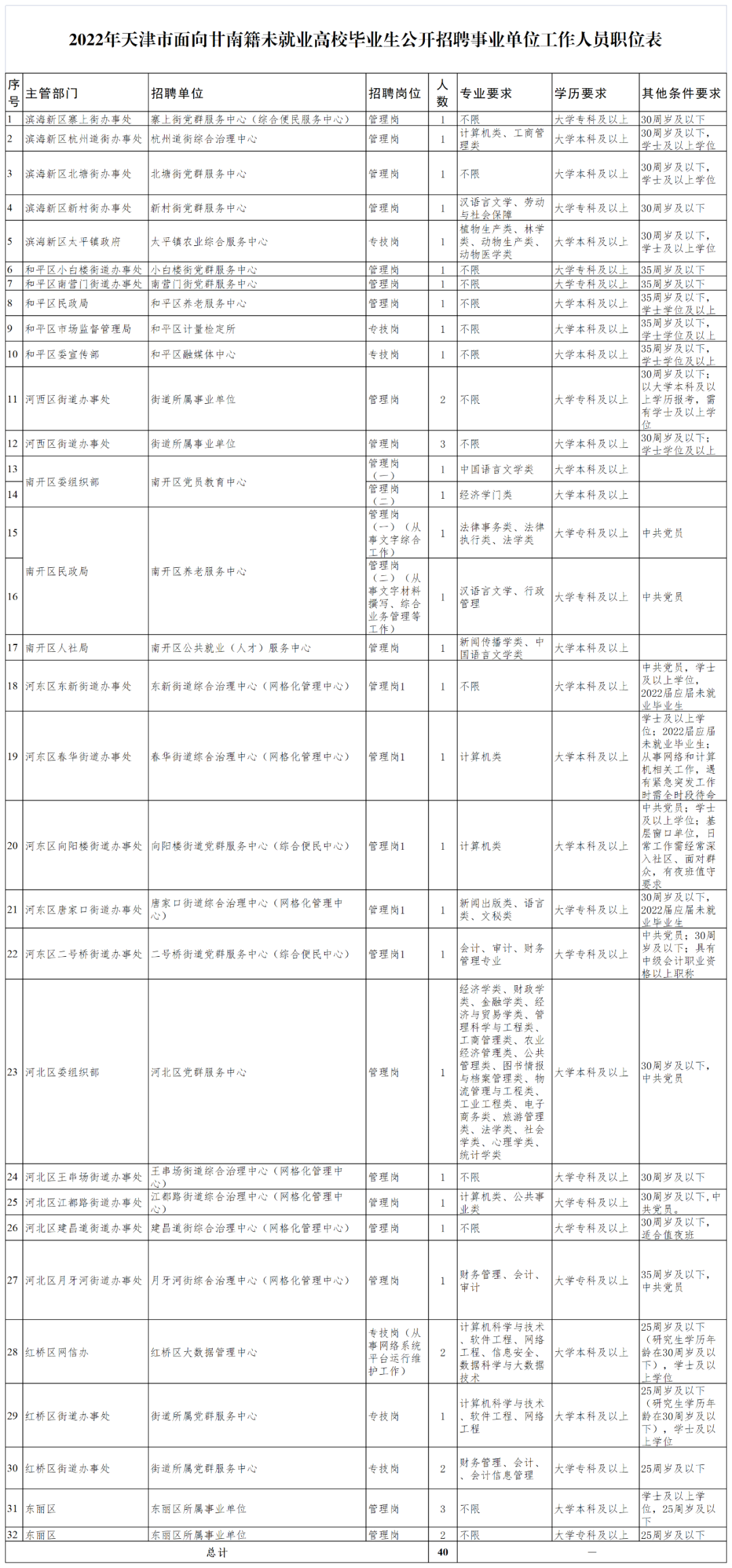 (四)其他条件详见《2022年天津市面向甘南籍未就业高校毕业生公开招聘事业单位工作人员职位表》。