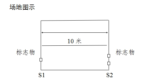 动作要求:受测试者采用站立式起跑,听到发令后从S1线外跑到S2线前(脚不得踩线)用手将竖立的木块推倒后折返,往返跑2次,每次推倒1个木块,第2次返回时冲出S1线。
