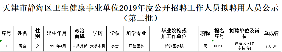 天津市静海区卫生健康事业单位2019年度公开招聘工作人员 拟聘用人员公示(第二批)
