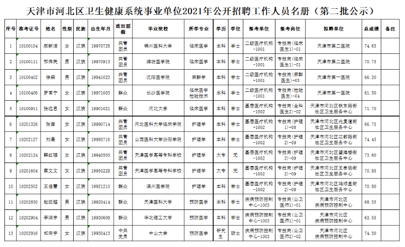 附件:天津市河北区卫生健康系统事业单位2021年公开招聘工作人员名册(第二批公示)