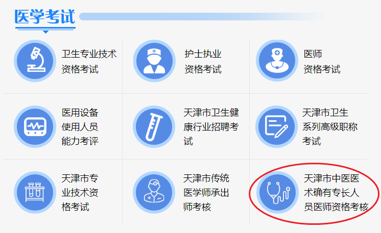打印路径:天津卫生人才网(http://www.tjwsrc.com/)首页“医学考试”栏目下,点击“天津市中医医术确有专长人员医师资格考核”。