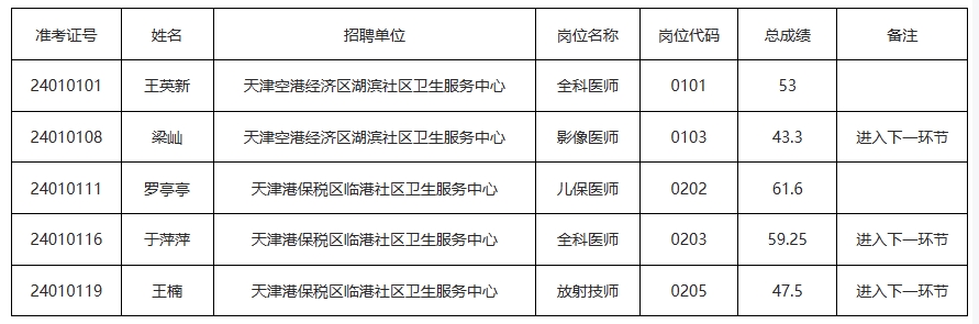天津港保税区2024年度社区卫生服务中心派遣制工作人员补充招聘总成绩公示