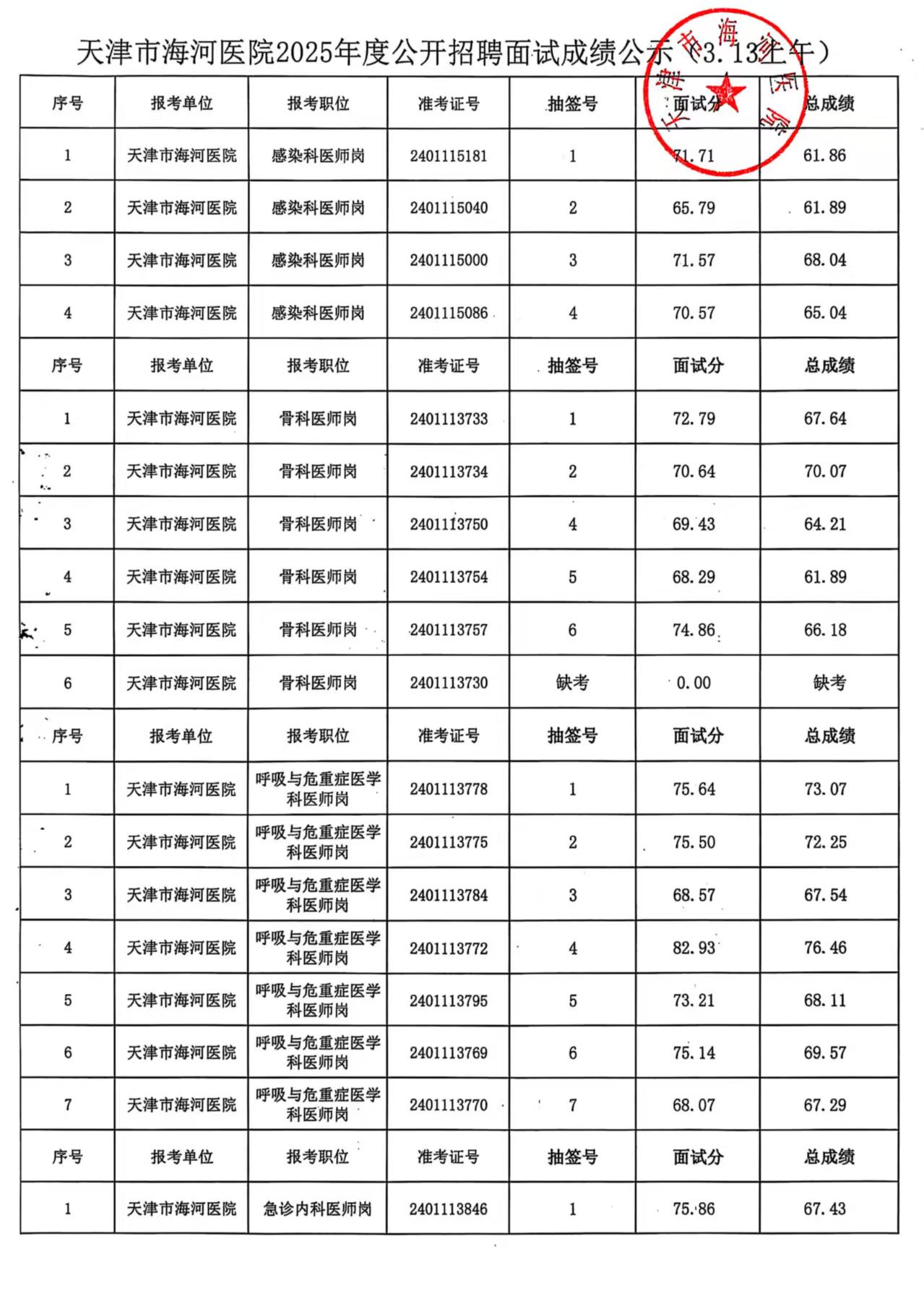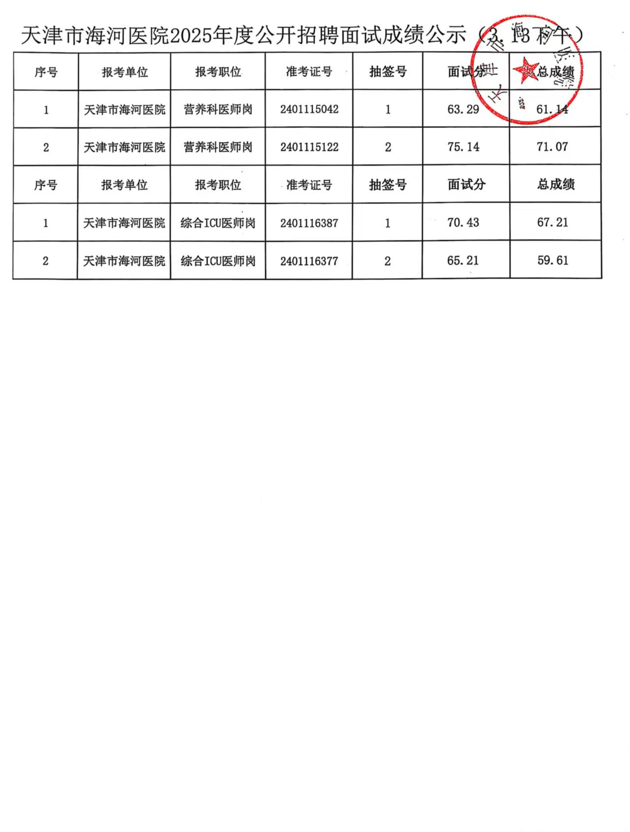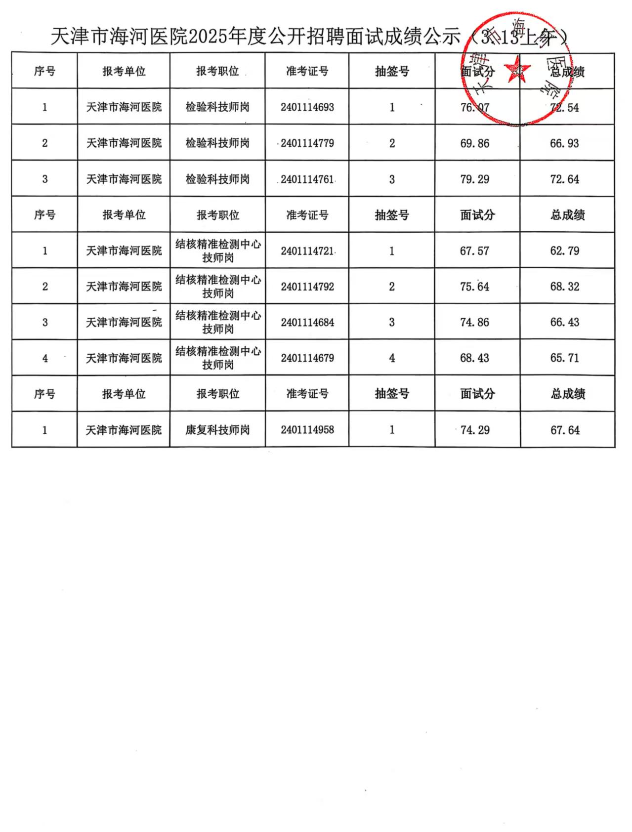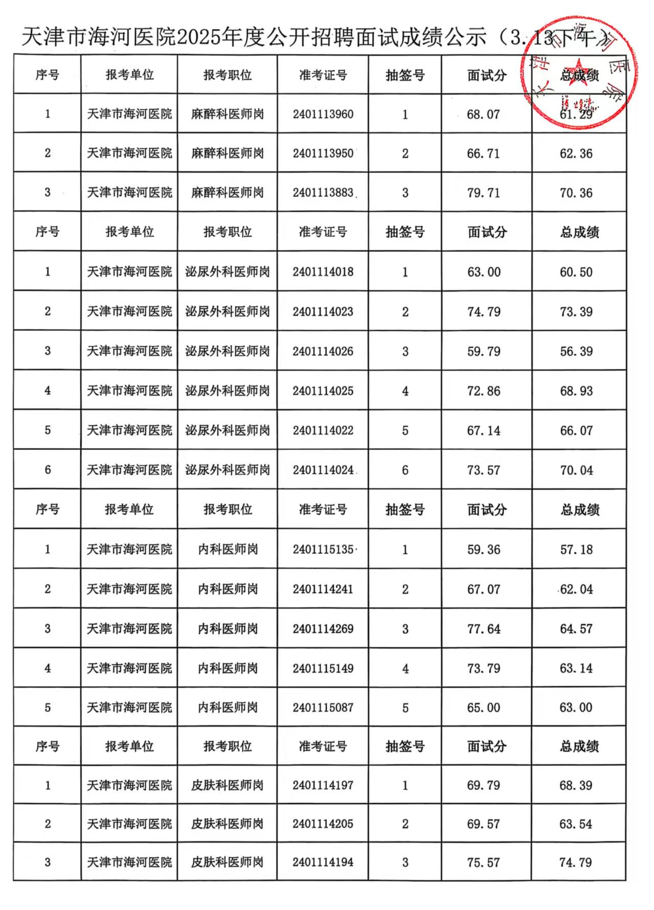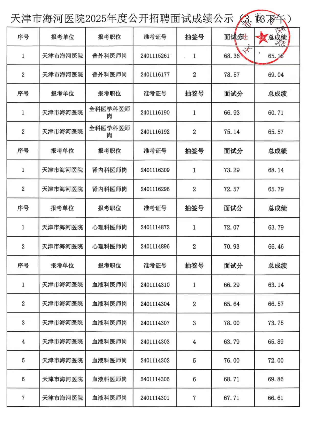 天津市海河医院2025年度公开招聘面试成绩公示(3.13上午、3.13下午)