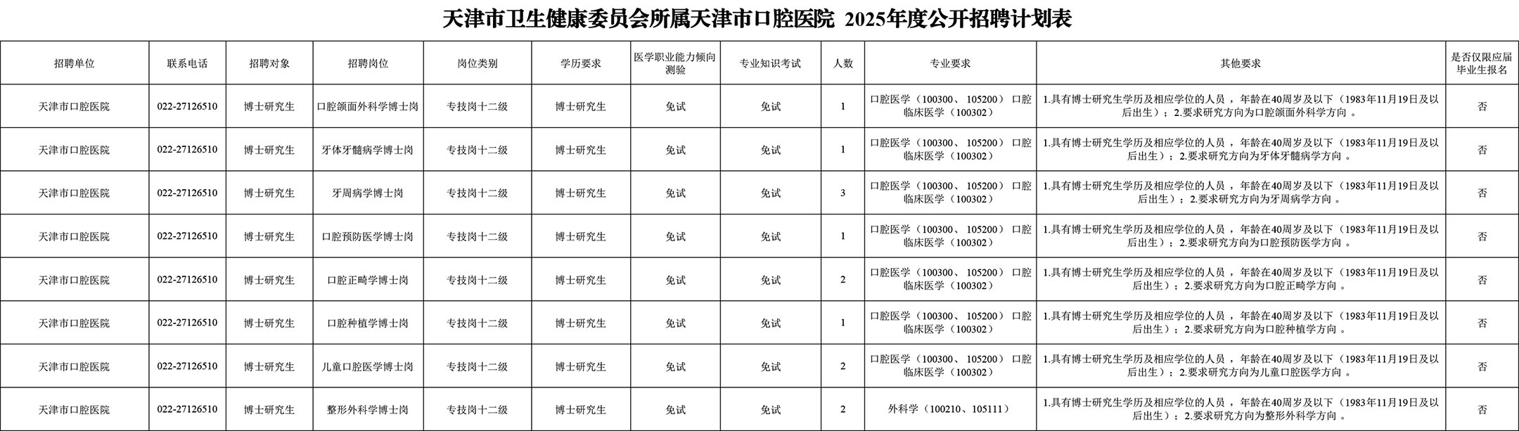 我单位博士研究生岗位招聘对象、条件、报名方式、工作程序及有关事项说明等详见《天津市卫生健康委员会所属天津市口腔医院2025年度公开招聘方案》(附件1)。《天津市卫生健康委员会所属天津市口腔医院2024年度公开招聘计划表》(附件2)。