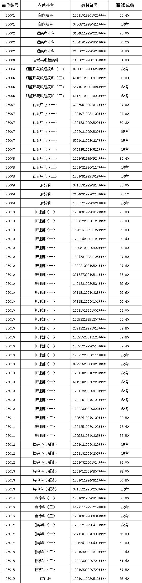 天津医科大学眼科医院2025年自主招聘面试成绩