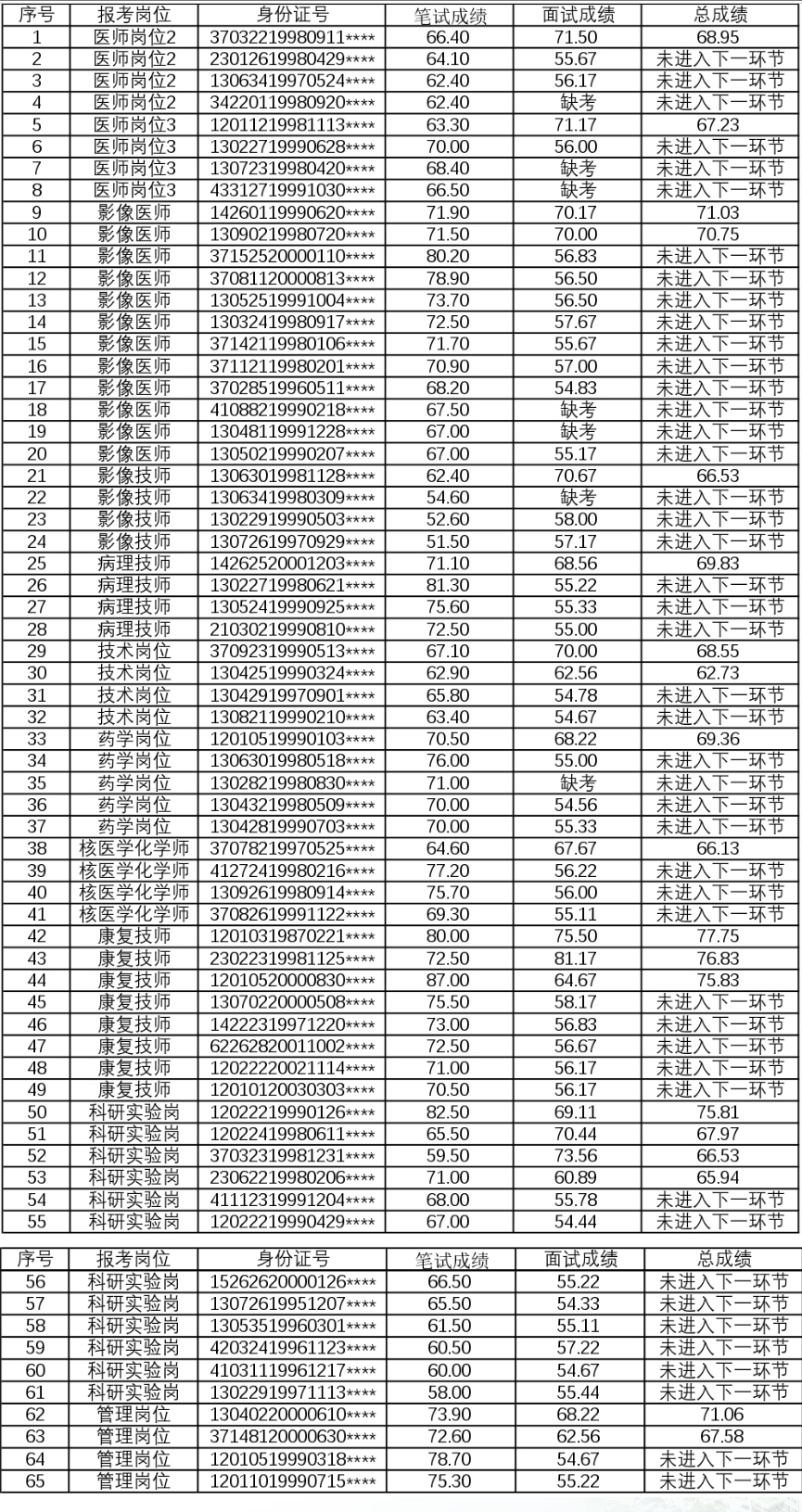 【2025年人事代理制招聘补录】天津医科大学肿瘤医院2025年第二批人事代理制工作人员招聘成绩