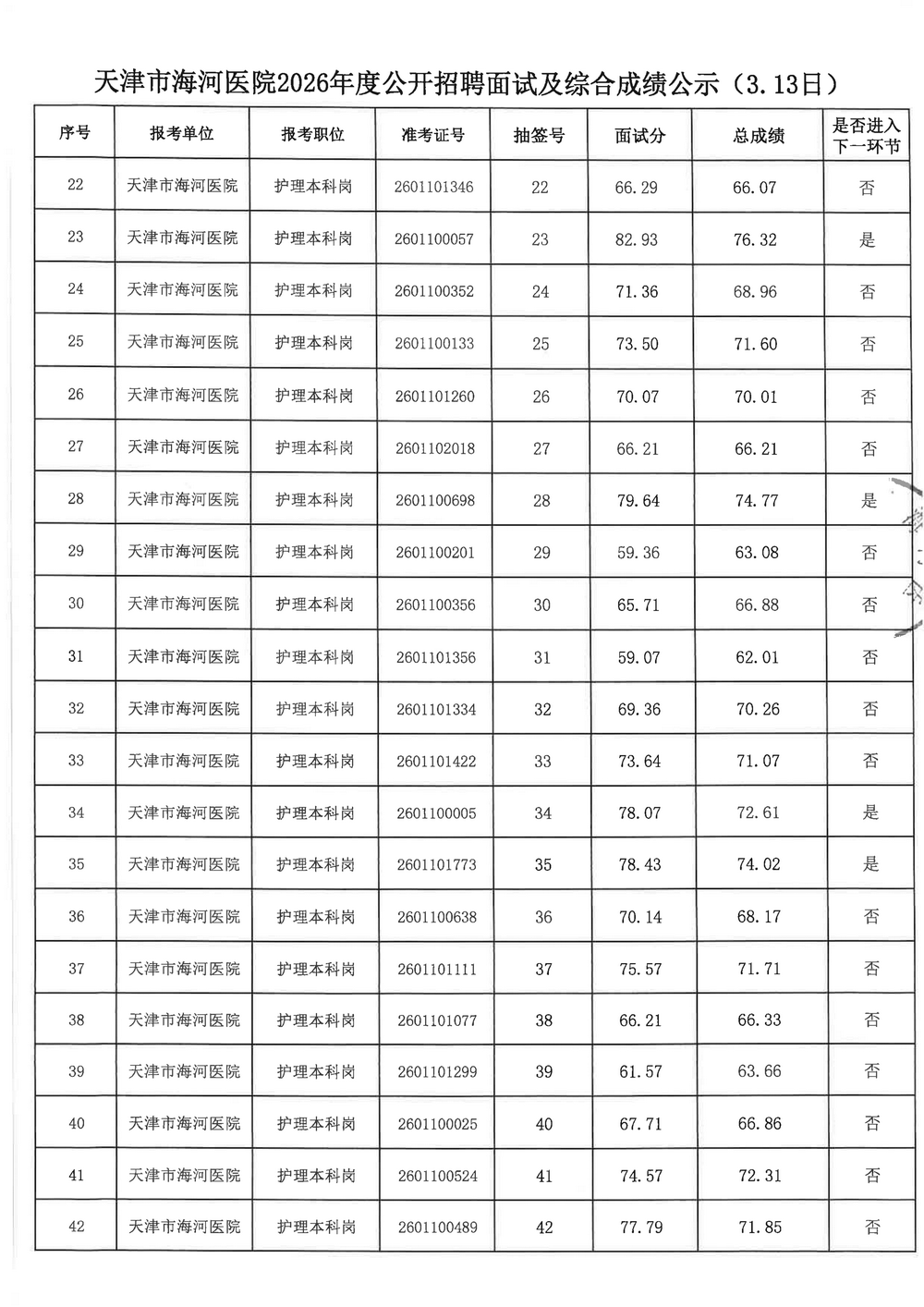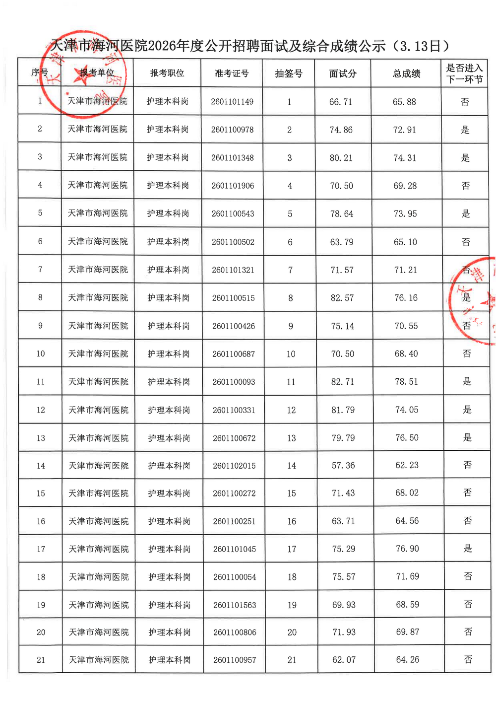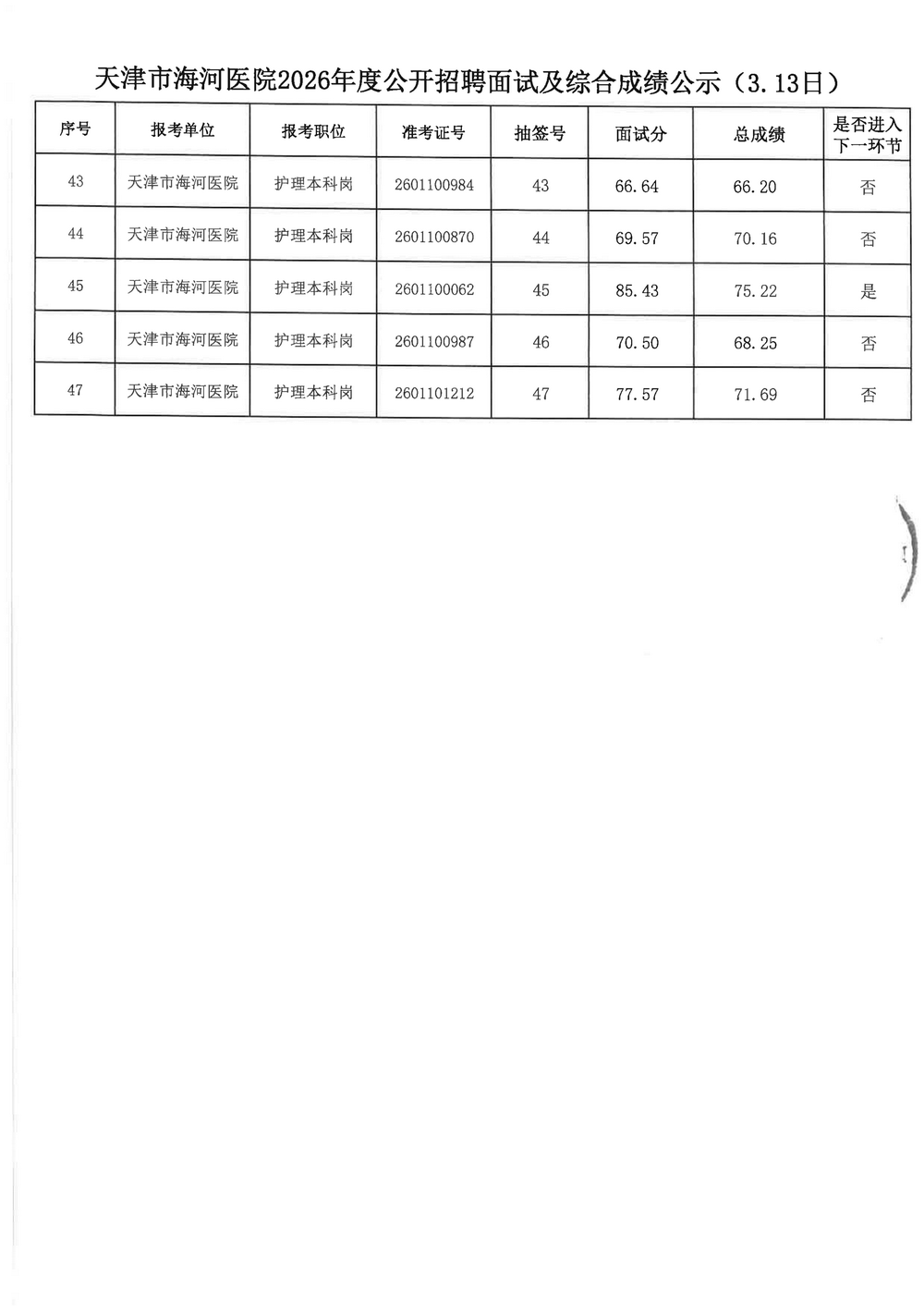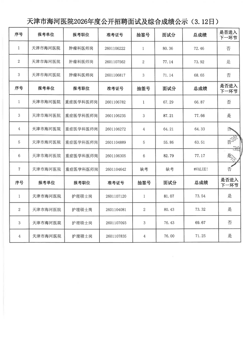 现将天津市海河医院2026年度公开招聘面试及综合成绩公示如下,公示期:2026年3月18日-3月26日。如有异议,请在公示期内以各种形式向天津市海河医院人事科提出。