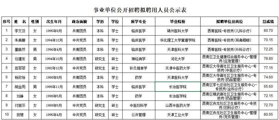 西青区2020年第二批公开招聘卫生健康系统工作人员公示公告