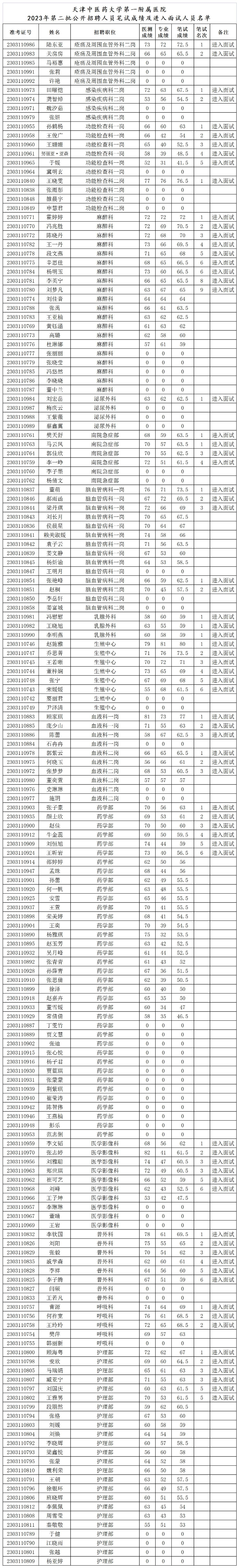天津中医药大学第一附属医院2023年第二批公开招聘人员笔试成绩及进入面试人员名单
