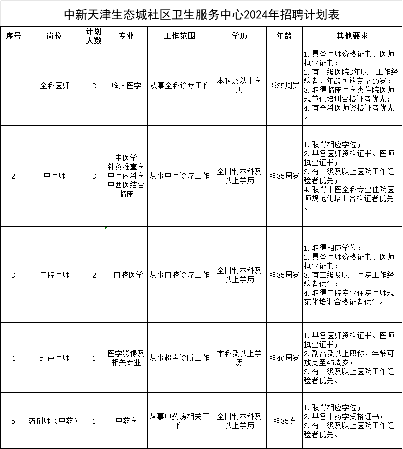 中新天津生态城社区卫生服务中心2024年公开招聘工作人员公告