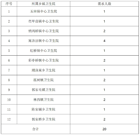 为全县12个乡镇招聘乡村医生20人,作为本乡镇乡村医生储备人才。按照《玉田县乡村一体化村卫生室乡村医生招聘方案》中的规定,由各乡镇卫生院对新招录人员进行储备或调配使用。查看河北各地最新招聘信息