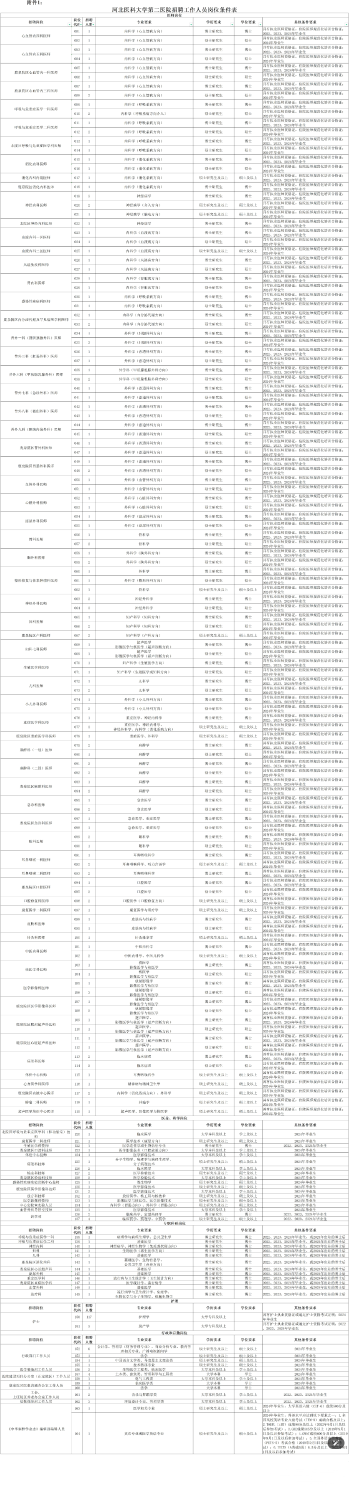 附件1.河北医科大学第二医院公开招聘工作人员岗位条件表