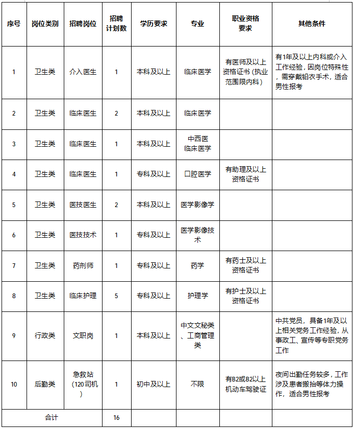 为加强医院人才队伍建设,根据医院发展需要,现面向社会公开招聘16名工作人员。 现将有关事项公告如下: