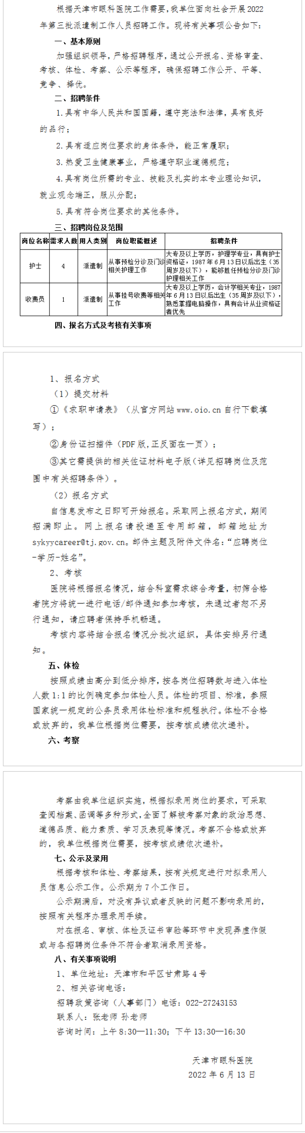 天津市眼科医院2022年招聘第三批派遣制工作人员公告