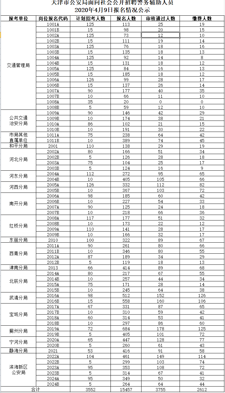 天津市公安局面向社会公开招聘警务辅助人员2020年4月9日报名情况公示