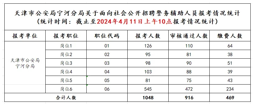 天津市公安局宁河分局关于面向社会公开招聘警务辅助人员报名统计(统计时间:2024年4月11日上午10点)