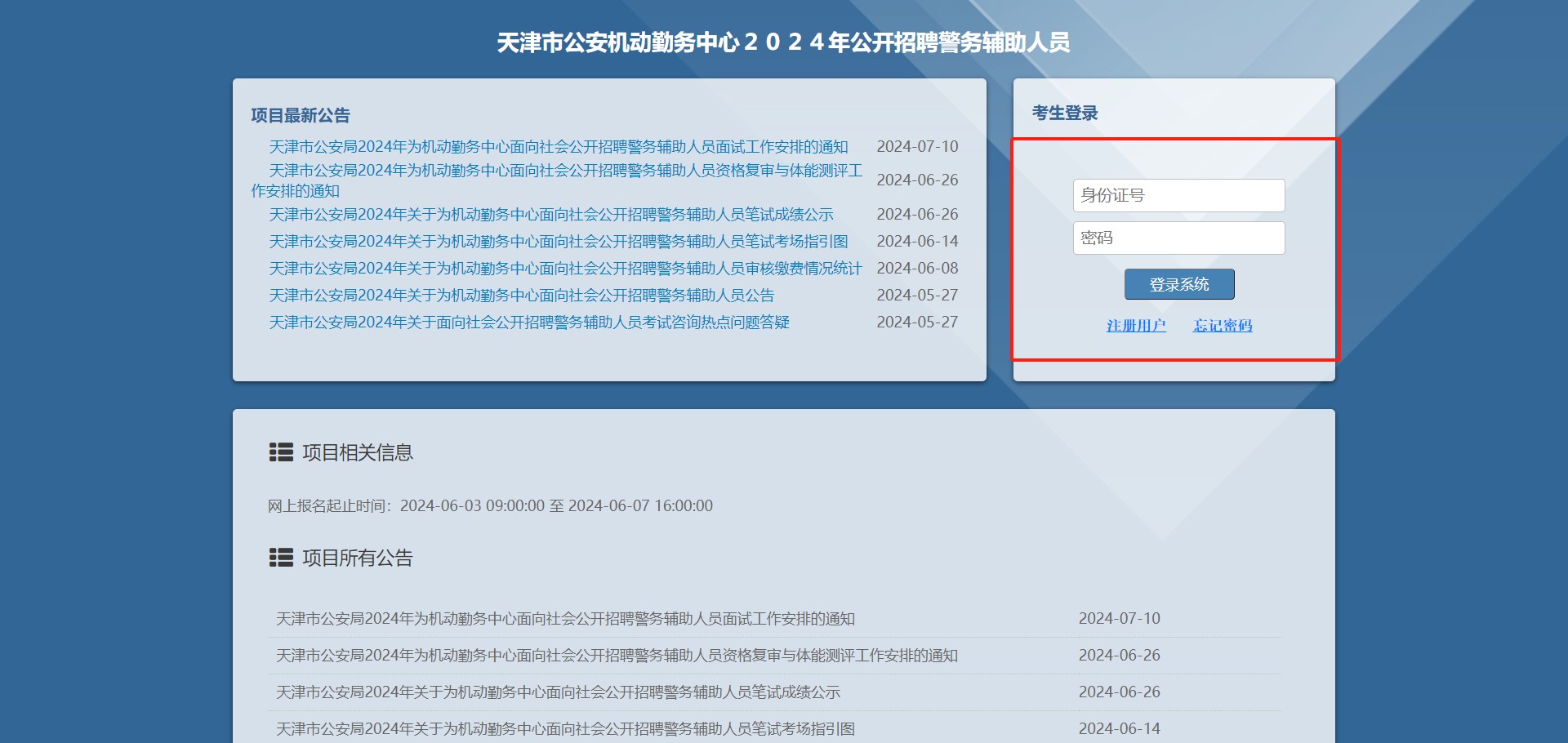 按照天津市公安局2024年为机动勤务中心面向社会公开招聘辅警工作的统一安排,进入体检和考察的考生,需在2024年7月19日上午9点至2024年7月22日下午5点期间,登录报名系统填写考察信息。具体内容如下: