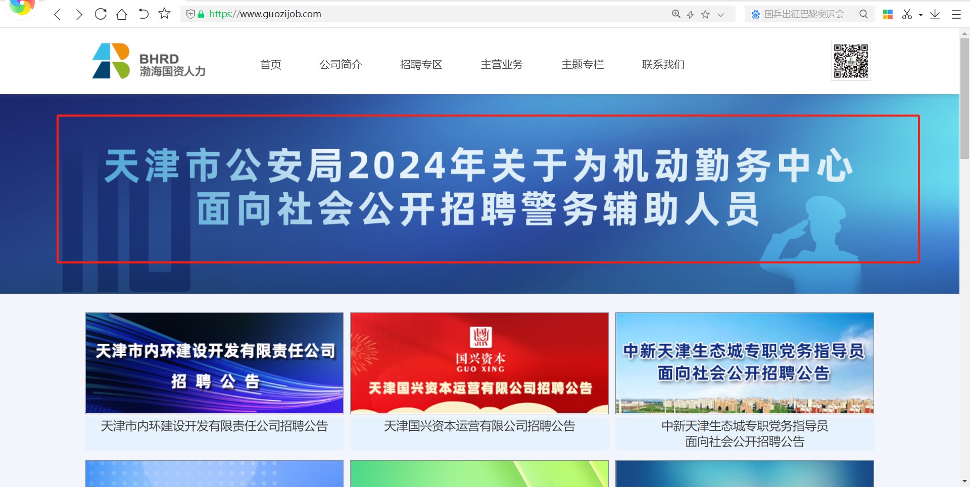 1、进入天津市渤海国资人力资源开发服务有限公司官网(http://www.guozijob.com/),点击“天津市公安局2024年关于为机动勤务中心面向社会公开招聘警务辅助人员”板块,进入报名系统。