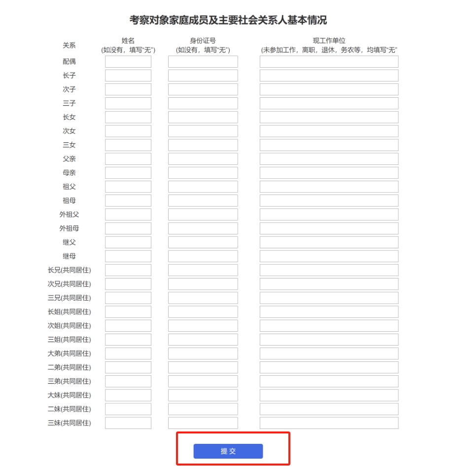 1、如考生无某一称谓的亲属,该亲属的“姓名”、“身份证号”及“现工作单位”处均需填写“无”。