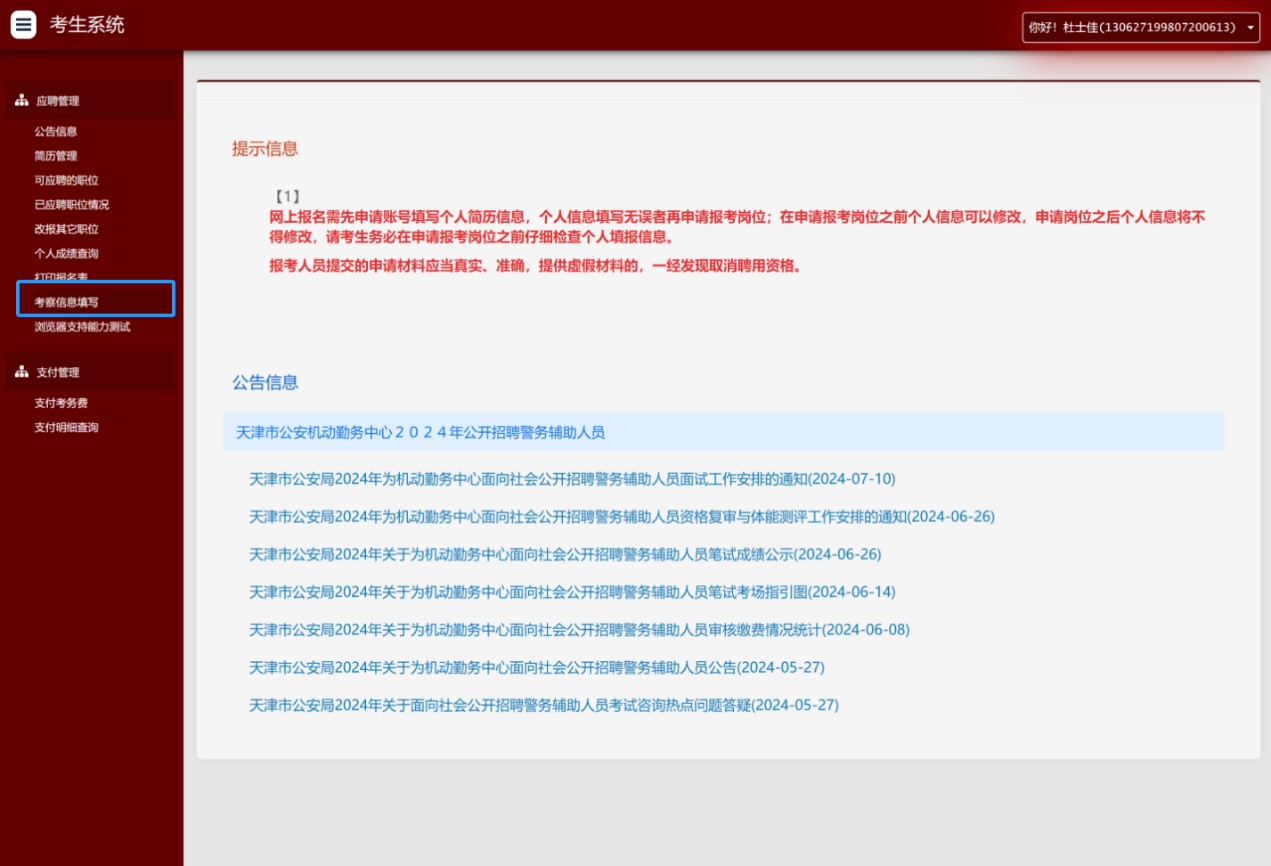 天津市公安局2024年为机动勤务中心面向社会公开招聘警务辅助人员考察信息填写操作指南