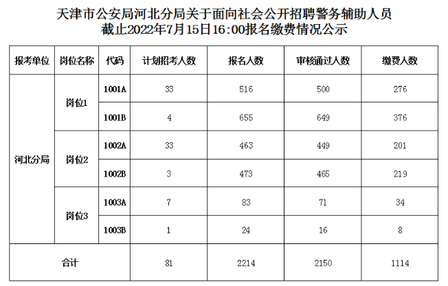 天津市公安局河北分局关于面向社会公开招聘警务辅助人员截止2022年7月15日16:00报名缴费情况公示