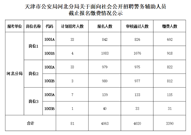 天津市公安局河北分局关于面向社会公开招聘警务辅助人员截止报名缴费情况公示