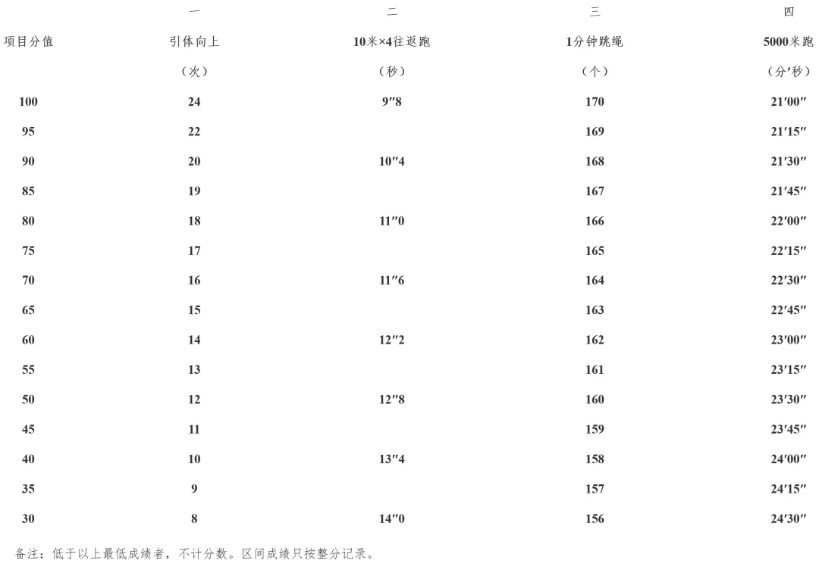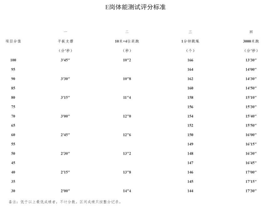 体能测试每项分值100分,满分400分。体能测试评分标准参照公安部治安管理局印发的《公安特警队专业训练与考核大纲》(2024年版)。